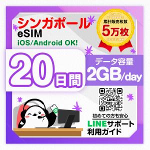 シンガポールeSIM:使用日数:20日間/データ容量:2GB(1day)/簡単設定/有効期限90日/最短即日発行/パスポート番号不要/データ通信専用