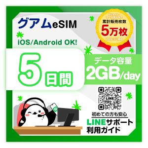 グアムeSIM:使用日数:5日間/データ容量:2GB(day)/簡単設定/有効期限90日/最短即日発行/パスポート番号不要/データ通信専用
