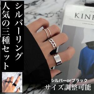 シルバーリング 3点セット 指輪 韓国ファッション 人気 おしゃれ レディース メンズ ペア リング 太リング チェーン 二連 フリーサイズ 合金 ユニセックス