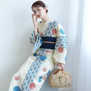 浴衣 レディース セット utatane 浴衣/帯/下駄 3点セット フリーサイズ 古典柄 レトロ 大正ロマン 綿麻 高級変わり織 先染めベージュ 紺色の麻の葉と鞠