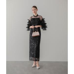 結婚式 ワンピース パーティードレス 刺繍 レース ロング 総レース 透け感 バックリボン タイト ペンシルスカート ボリューム袖 ロング丈 ミモレ丈 袖あり