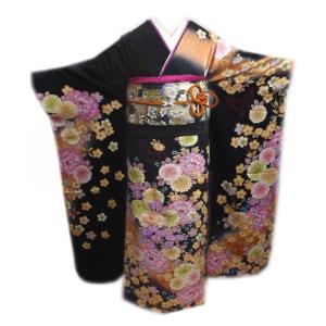 【訳有り 少難あり】 振袖 正絹 お買上 お仕立上がり 袋帯 長襦袢 3点セット ブランド 黒色地菊桜牡丹橙ぼかし L 成人式