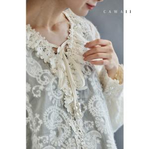 Sから3L対応 花レースネックのふわふわ起毛シアーブラウストップス