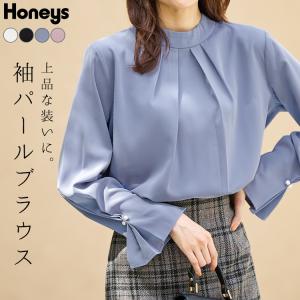 トップス ブラウス 長袖 オフィス きれいめ パール ハイネック フェミニン レディース Honeys ハニーズ 袖パールブラウス