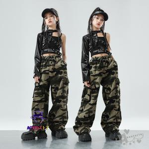 ダンス衣装 k-pop衣装 ヒップホップ ブラックインナー 黒レザーワンショルダー 迷彩柄パンツ へそ出し キッズ ガールズ 女の子 セットアップ 派手 K-POP 韓国
