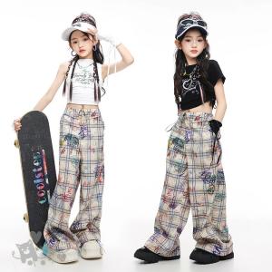 k-pop衣装 キッズダンス衣装 HIPHOP ヒップホップ 子供服 女の子 白ベスト 黒Tシャツチェック柄パンツへそ出し ガールズ K-POP ステージ衣装 練習着 演出服 舞