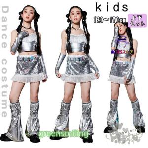 キッズ k-pop衣装 ダンス衣装 ヒップホップ チアガールズ シルバー セットアップ JAZZ 女の子 キラキラ トップス 袖カバー パンツ 銀色 セットアップ へ