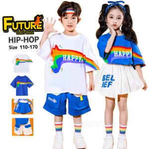 k-pop 衣装 チアダンス 衣装 小学生 キッズダンス衣装 セットアップ 青 スカート 白 パンツ tシャツ トップス 半袖 ブルー 虹 虹色 ヒップホップ キッズ チアガ