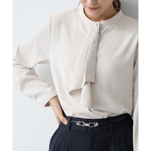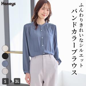 トップス ブラウス 長袖 大きいサイズ オフィス きれいめ 再生ポリエステル バンドカラー ギャザー レディース Honeys ハニーズ バンドカラーブラウス