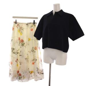 未使用品 ミラオーウェン Mila Owen 25SS セットアップ 上下 短丈スキッパーポロニット スカート ロング 花柄 フレア 0 紺 ネイビー 白