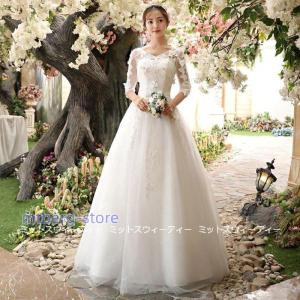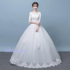 ウェディングドレス 二次会 結婚式 披露宴 ブライダル ロングドレス 5分袖 ラウンドネック 花嫁 ウエディングドレス プリンセスライン ホワイト 編み上げ レース