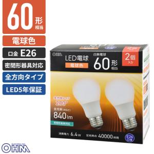 オーム電機 LED電球 E26 60形相当 電球色 2個入 LDA6L-G AG59 2P