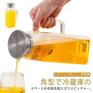 麦茶ポット 2L 大容量 冷水筒 耐熱ガラス 冷水ポット ピッチャー 広口 洗いやすい 2リットル 取っ手付き お茶ポット ティーポット スクエアサー