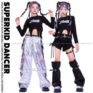 キッズダンス衣装 セットアップ 派手 メタル へそ出し キラキラトップス 銀 シルバー 黒 K-POP 韓国 ガールズ ヒップホップ 衣装 子供ダンス服 ダンスウェア