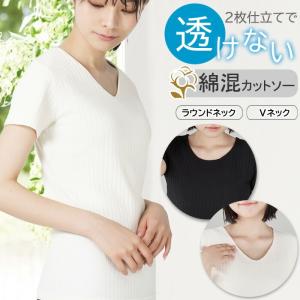 カットソー 長袖 レディース きれいめ 透けない 前身頃2重 長袖 Vネック 丸首 スーツ インナー 白 黒 グレー ベージュ シンプル 仕事 オフィス 透けない