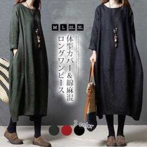 ワンピース レディース 春 コットンリネン 秋 ロングワンピース 長袖 体型カバー 大きいサイズ ゆったり 着痩せ 30代 40代 50代