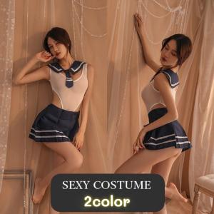 セクシーコスチューム セーラー服風 コスプレ衣装 テディ ミニスカート 2点セット ネクタイ付き レディース シースルー 透け感 ハイレグ レオタード