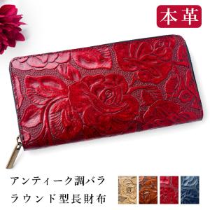 長財布 レディース 本革 財布 バラ ラウンドファスナー サイフ ウォレット 革 牛革 レザー カード収納 革財布 長サイフ 本革長財布 アンティーク調 バラ