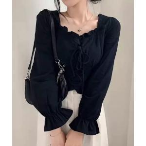 ブラウス シャツ レースアップリボン フリルネック ブラウス レディース