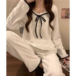 パジャマ ルームウェア 「上下セット」「2点セット」フリース フロントリボンデザインスクエアネックルームウェア リボン柄 レディース