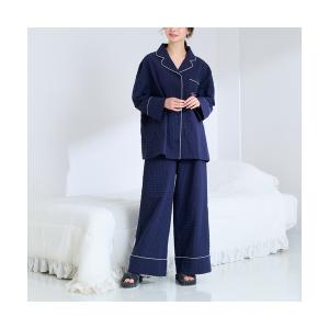 パジャマ ルームウェア ロゴ刺繍 チェックジャガードパジャマ ネイビー レディース