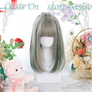 フルウィッグ かつら ふんわり前髪 ぱっつん前髪 グリーン インナーカラー 前髪あり 自然 可愛い キュート 原宿風 ウイッグ wig