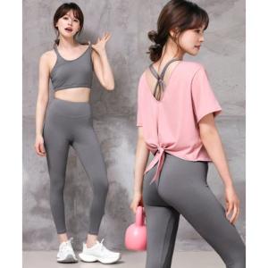 テディショップ Teddyshop レディース 半袖ヨガウェアトップス+スポーツブラ+レギンス 3点セットアップ[フィットネス/ピラティス/ダンス/ジ