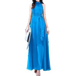 シフォン ロング ドレス パーティー 結婚式 二次会 マキシ丈 後ろリボン ウエストマーク( ブルー, Free Size)