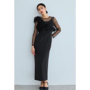 ドレス フェザーフラワーチュールパーティードレスセレモニーミモレ丈&袖あり結婚式二次会フォーマルオケージョンドレス同窓会成人式ロングカフスAライン お