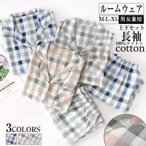 ペアパジャマ メンズ レディース 春秋 長袖 前開き 綿100% ガーゼ 上下セット ルームウェア チェック 可愛い カップル ペアルック 夫婦
