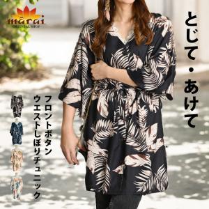 チュニック 柄 レディース 前を閉じて開けて2Wayで着こなし。フロントボタンウエストしぼりチュニック ブラウス 七分袖 30代 40代 50代 60代