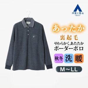 【洋服の青山】ふんわり リブ襟ポロシャツ 長袖 メンズ 秋冬 ネイビー 紺 ボーダー ブークレー 裏起毛 暖かい 着心地良い 柔らかい 洗える トップス カジュアル