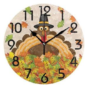 【並行輸入品】 Naanle かわいい漫画 感謝祭 七面鳥 紅葉プリント ラウンド 壁掛け時計 装飾 9.5インチ 電池式 クォーツ アナログ 静音 デスククロック