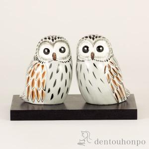 九谷焼 ペア梟 白彩 3号 台付 ( 木札名入れ有料 退職祝い 定年 フクロウ 置物 玄関 風水 小物 セット 九谷焼 結婚 出産 内祝い 引き出物 金婚式 )
