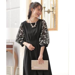 ドレス 袖チュールレース使いウエストタックデザインワンピースドレス「大きいサイズ有」