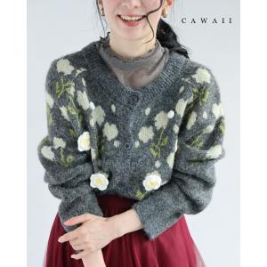 Sから3L対応 浮き立つ花コサージュの起毛ニットカーディガン