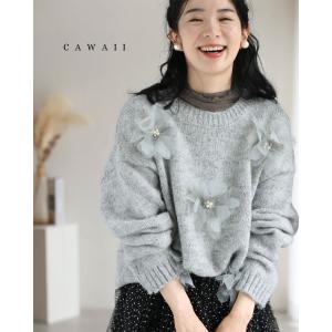Sから3L対応 満開の花コサージュニットプルオーバートップス