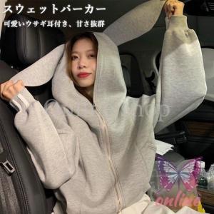 パーカー 秋 レディース スウェットパーカー ゆったり ウサギ耳 スウェット グレー スウェットトップス フード付き 体型カバー カジュアルトップス