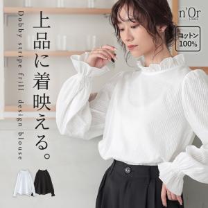 ブラウス レディース 長袖 トップス スタンドカラー フリル ストライプ柄 綿100% パフスリーブ シャーリング袖 ドビー織 メロー 春 秋 冬 メール便可「5」