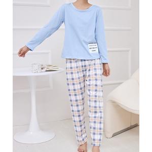 パジャマ ルームウェア ラウンドネック 配色 チェック 長袖 ルームウエア レディース