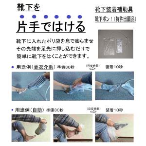 ソックスエイド靴下ポン。靴下を片手ではける装着補助具。靴下に入れたポリ袋を息で膨らませ、足先からはき上げるため、どんな靴下でもOK。掌サイズで携帯に便利