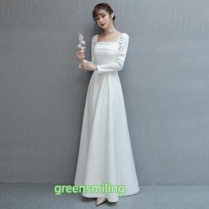 ウェディングドレス 二次会 結婚式 ブライダル ロングドレス サテン 長袖 シンプル ホワイト 前撮り 挙式 花嫁 ウエディングドレス 編み上げ パーティー