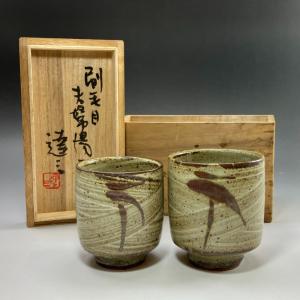 人間国宝 島岡達三 造 刷毛目夫婦湯呑 陶磁器 【I192925017】