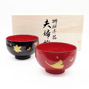 会津塗 夫婦 汁椀 木製 漆 春秋 おしゃれ 木箱入り 漆器 ペア 紅葉 イチョウ 桜 黒 朱 金 かわいい