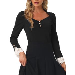 Allegra K ブラウス エレガントトップス ビクトリア朝 ヴィンテージ レーストリム 長袖 ハートネック レディース ブラックxS