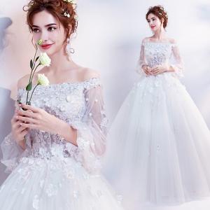 ウェディングドレス 白 格安 レース 結婚式 花嫁 袖あり プリンセス ロングドレス ブライダル 二次会 パーティードレス 披露宴 プリンセスドレス 大きいサイズ