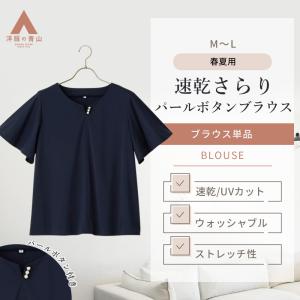 【洋服の青山】春夏 ネイビー系 パールボタン付きキーネックブラウス《半袖》 半袖 キーネック パール調ボタン フレア袖