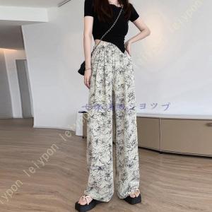 夏 ワイドパンツ 涼しい ゆったり ガウチョ パンツ トレンド 韓国ファッション 美脚 ハイウェスト カジュアルパンツ 総柄 ワイドレッグパンツ レディース