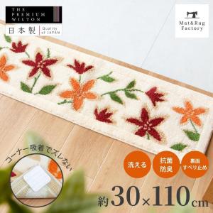 玄関マット おしゃれ 屋内 風水 パシオーネ 約30×110cm コーナー吸着つき 吸着シート 洗える 室内 日本製 ウィルトン織り おしゃれ 花柄 赤 オレンジ オカ