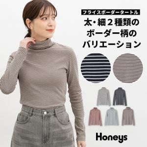 トップス カットソー 長袖 オーガニックコットン タートルネック 綿100% フライス編み ボーダー柄 レディース Honeys ハニーズ フライスボーダータートル